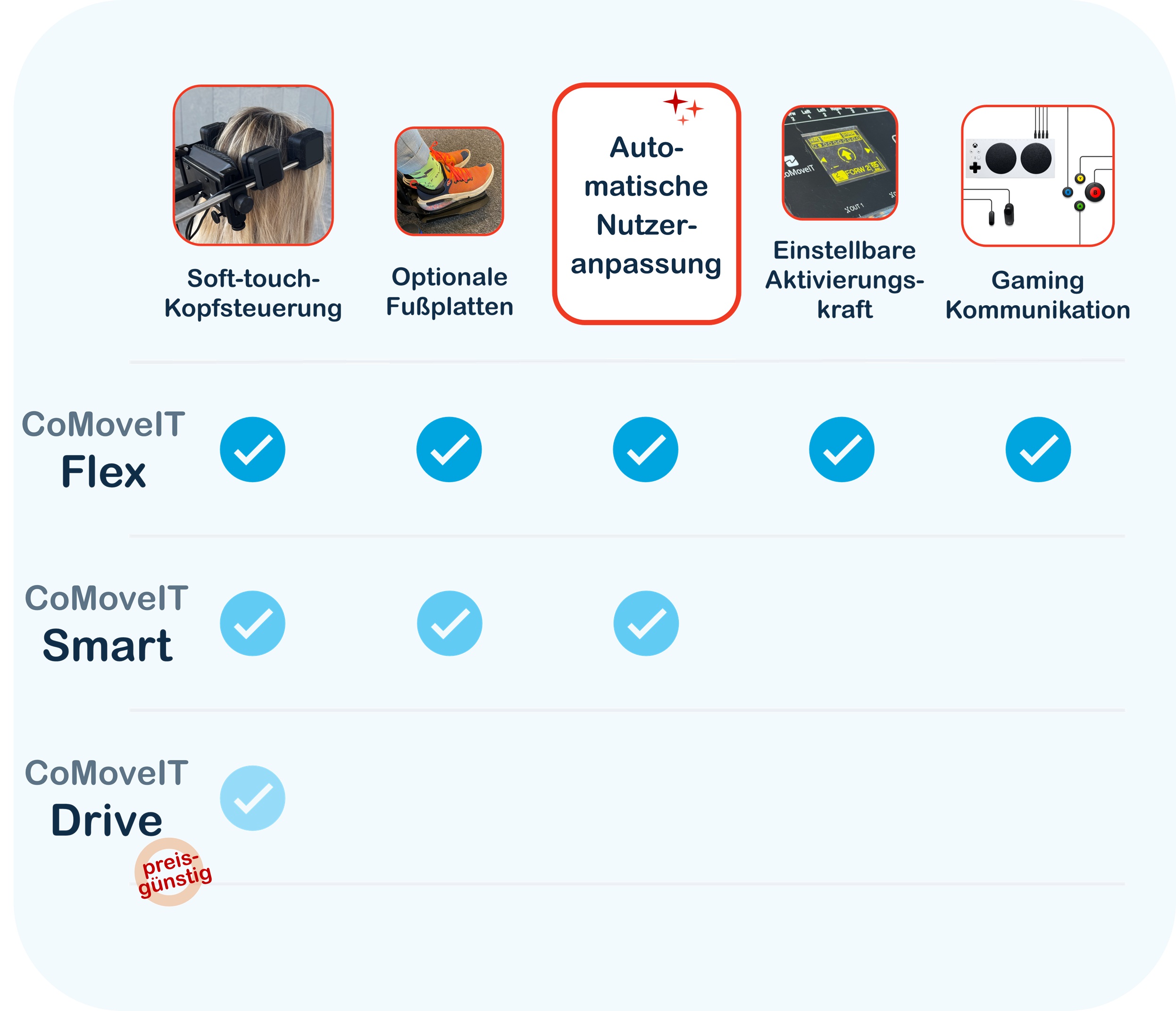 Der CoMoveIT Smart ist ein einzigartiges Lenksystem, das die Steuerung des Rollstuhls an den Benutzer anpasst. Das System verfolgt die Art und Weise, wie es vom Fahrer benutzt wird und passt die Steuerung automatisch an den Fahrer an. Selbst bei hoher Spannung, sehr geringer Kraft oder unterbrochenem Druck überträgt das System die richtigen Signale an den Rollstuhl, um eine reibungslose Steuerung durch den Fahrer zu ermöglichen.